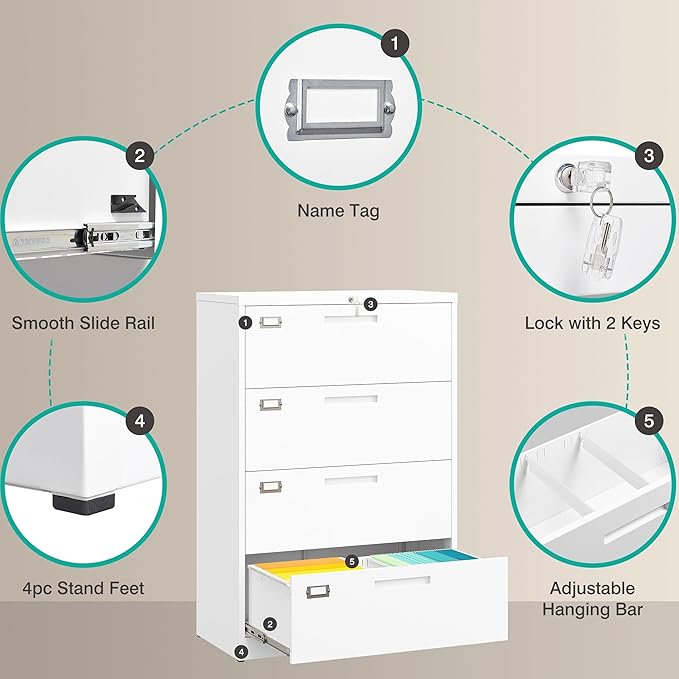 - 【Anti-tilt Mechanism】: All drawer interlocking mechanisms are designed to prevent tilting and ensure that only one drawer can be opened at a time; the file cabinet has 1 lock and 2 foldable keys to effectively protect your private documents and valuables. It is suitable for various scenes such as offices,home