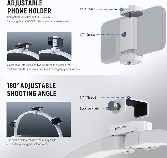 - 【Adjustable Phone Holder】 The cell phone mount of this portable NEEWER LED half circle desk ring light is compatible with iPhone 16 15 Pro Max Samsung Galaxy S25 S24 Ultra, etc. It attaches to the lamp with a locking knob, features rubber pads to prevent any scratches. A cold shoe and 1/4" thread for mounting small photography videography accessories, ideal desktop half ringlight lighting for nail tech selfies, pictures, video recording, filming for YouTube TikTok social media sharing
