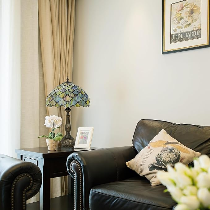 Tiffany Style Table Lamp Vintage Stained Glass Desk Lamp Mable Gradient Green Fish Scales Bedside Reading Light Decor Bedroom Living Room Home Office D12 xH18 (Green Fish Scales)