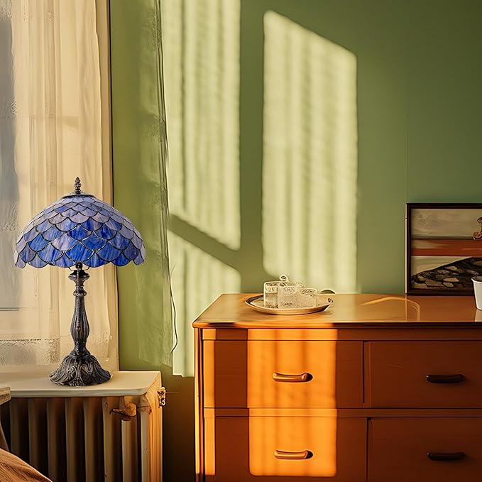 Tiffany Style Table Lamp Vintage Stained Glass Desk Lamp Deep Blue Purple Fish Scales Bedside Reading Light Decor Bedroom Living Room Home Office D12 xH18