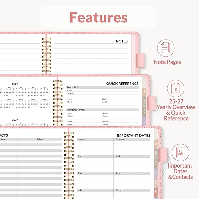 - Additional Features - The weekly planner includes 2026-2028 calendars, year schedule for full year 2026, holiday lists, contact pages, notes pages, important dates, and US time zone map. Beautiful monthly tabs simplify navigation and add a stylish, playful element to the planner's aesthetic.