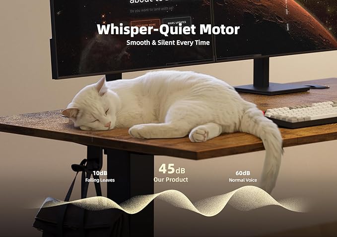 - Smart Electric Lift: Seamlessly adjusting from 28.3 inches to 46.5 inches, this adjustable desk is perfect for any situation - whether it's work, study or meetings. The whisper-quiet motor operates at under 45dB, so you can stay focused and undisturbed throughout the day.