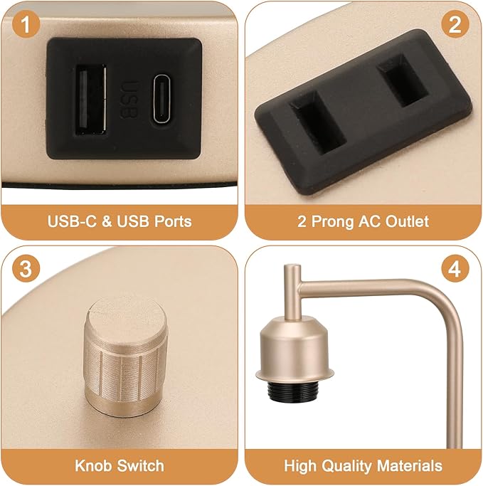 - USB-C & USB & AC OUTLET CHARGING PORTS - The farmhouse bedside lamp with usb port integrated with a USB-C port, a USB port and a 2-prong AC outlet (5V/2.1A), which are available for use whether the industrial lamp for nightstand is on or off. With that you'll have an easy access to charge mobile phones, tablets, kindle readers, e-watch, mini-humidifier and others
