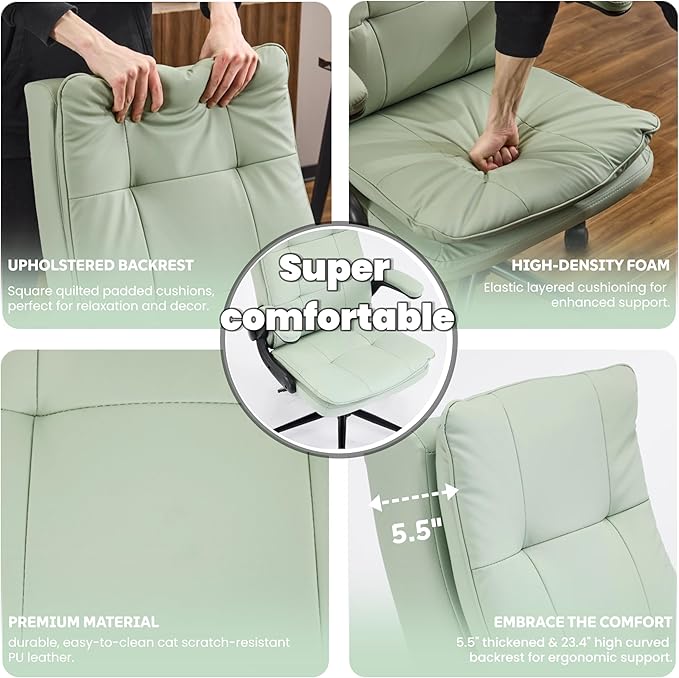 - 3.💪 STURDY QUALITY & MULTI-ADJUSTABLE FEATURES:Enjoy whisper-quiet mobility with floor-friendly wheels, height adjustment, tilt mechanism, and smooth 360° swivel for both work and relaxation. The computer chair features an SGS-certified gas lift supporting up to 330LBS,reinforced metal base, premium elastic foam padding, and cat-scratch-resistant PU leather that's easy to clean. Premium materials ensure long-lasting durability.