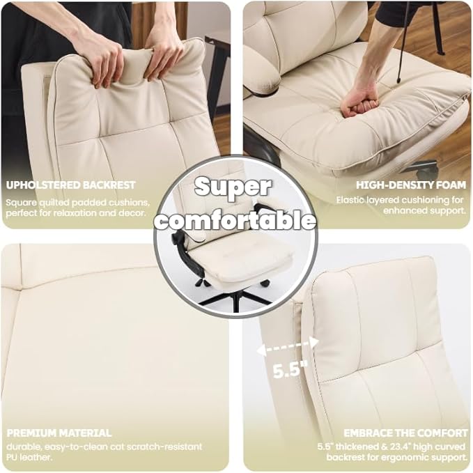 - 3.💪 STURDY QUALITY & MULTI-ADJUSTABLE FEATURES:Enjoy whisper-quiet mobility with floor-friendly wheels, height adjustment, tilt mechanism, and smooth 360° swivel for both work and relaxation. The computer chair features an SGS-certified gas lift supporting up to 330LBS,reinforced metal base, premium elastic foam padding, and cat-scratch-resistant PU leather that's easy to clean. Premium materials ensure long-lasting durability.