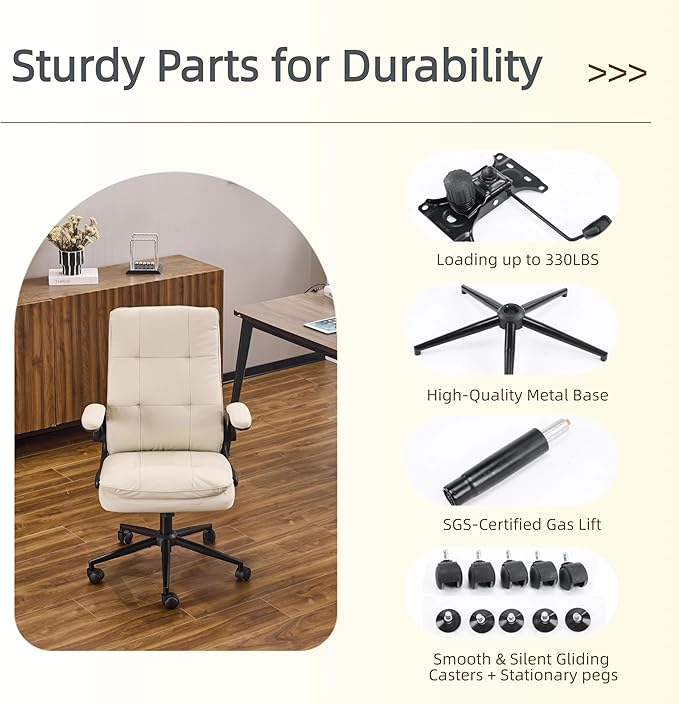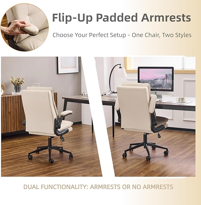 VINGLI Comfy Beige Leather Office Desk Chair, High-Back Support Ergonomic Computer Task Gaming Chair,with Removable wheels,360° Swivel,Adjustable Height,Flip-Up Arms,for Adults,Teen,Vanity,Home Office
