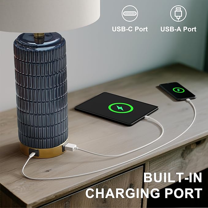 - Touch Control Blue Lamps: This touch lamps is equipped with a touch sensor, enabling quick adjustments to 3 distinct brightness levels (Low, Medium, High). Just a gentle touch or pat on the gold base of the touch bedside lamps for nightstands when you wish to turn the dimmable lamps with usb port on/off or make it brighter/dimmer.