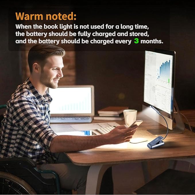 - 【Rechargeable & Long-lasting Lighting】 The battery life is great. Usb rechargeable with a built-in battery that can last up to 25 hours of use(LOW Mode). At High Mode, the reading light can last up to 5 hours lighting time. No need to buy batteries any more, save money. The correctly charging book light will make your reading light more durable. Please charge the book light every 3 months. When book lights are not used for a long time, the reading lights should be fully charged before stored.