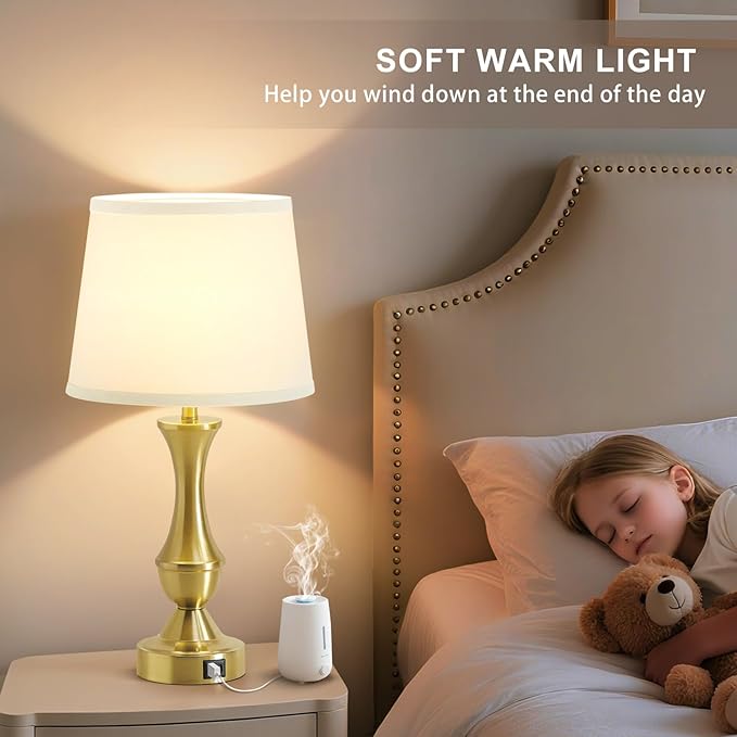 Luvkczc 22" Gold Table Lamps Set of 2 - Modern Luxury Bedside Lamps with White Fabric Shade, 3-Way Dimmable & Dual USB C+A Ports, Nightstand Lamps for Bedroom/Living Room (Bulb Included)