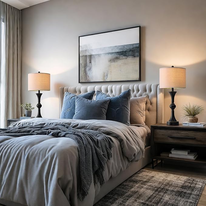 - 【Stylish & Modern table lamps】This elegant table lamp features a premium matte black metal finish paired with a natural oatmeal linen shade, blending modern and rustic aesthetics. The soft, diffused lighting is flicker-free and eye-friendly, making it a perfect lamp for bedroom nightstands or as lamps for living room accents.