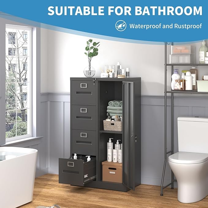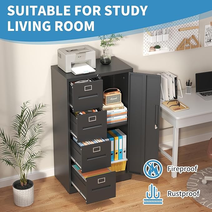 4 Drawer Metal File Cabinet with Lock and 1 Door, Steel Vertical Filing Cabinets for Home Office, Metal Storage Cabinet for Hanging Legal/Letter Size Files, Assembly Required (Black)