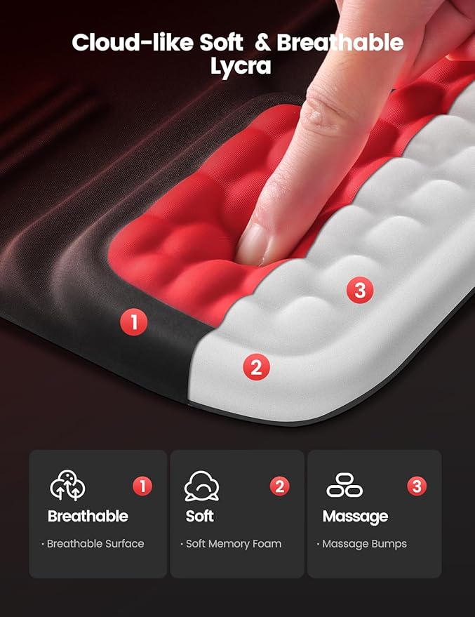 - 【Cloud-Like Comfort with Tactical Support】Engineered with a breathable fabric surface to keep skin cool, slow-rebound memory foam that delivers long-lasting cushioning, and raised massage bumps to improve airflow and gently stimulate the wrists. The keyboard riser for desk keeps your wrists comfortable, cushioned, and energized through extended gaming or working marathons.