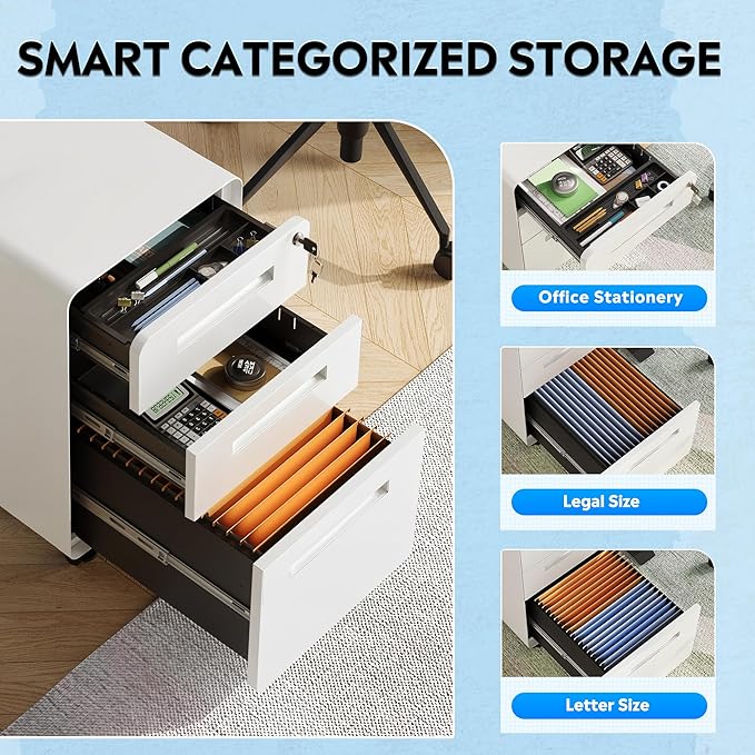 - đď¸ăSmart Categorized StorageăTwo upper drawers include a adjustable divider and a stationery tray, while the deep bottom drawer fits Letter and Legal-size hanging files. Get organized and find essentials fast.