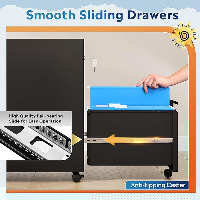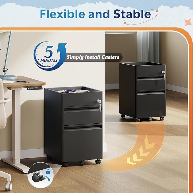 - 【Stable & Easy to Move】: Black filing cabinet use 5-casters design—2 locking front wheels and 1 center support casters—offers both smooth mobility and anti-tip stability.