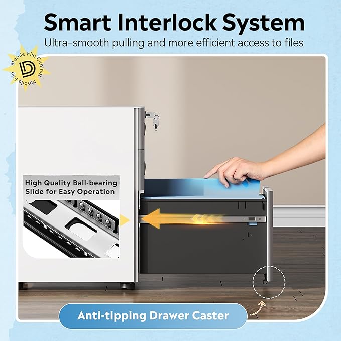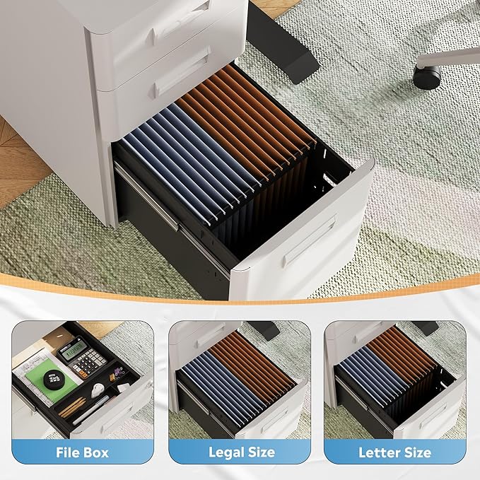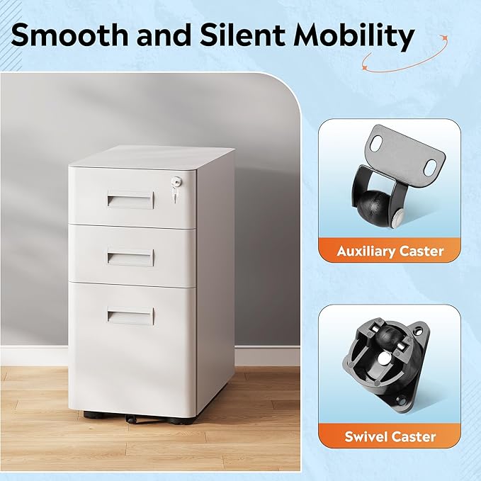 - 【Fully Assembled & Easy Mobility】: Get organized in minutes! This steel file cabinet comes 99% pre-built—just attach the wheels. With four 360° swivel casters and one anti-tip caster, this mobile file cabinet glides smoothly anywhere. Perfect as a rolling file cabinet for under desk.