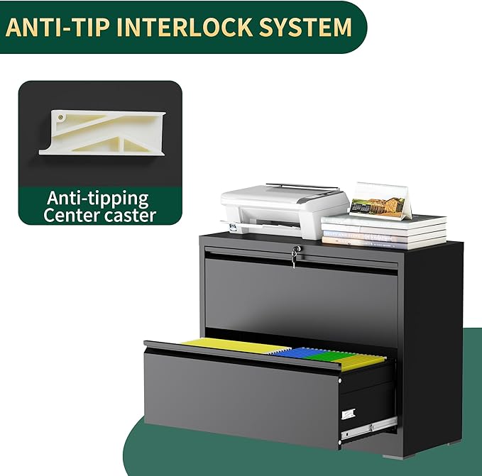 - 【Privacy Security and Anti-tilt Design】The interlock system secures the 2 drawers and comes with two keys to protect your files. The anti-tilt system ensures that only one drawer can be open at a time, preventing the metal file cabinet from tipping over. You can have peace of mind knowing that your important documents and items are safe and secure.