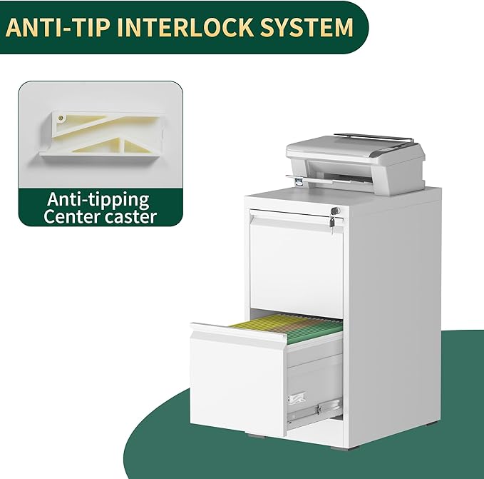 - 【Privacy Security and Anti-tilt Design】The interlock system secures the 2 drawers and comes with two keys to protect your files. The anti-tilt system ensures that only one drawer can be open at a time, preventing the metal file cabinet from tipping over. You can have peace of mind knowing that your important documents and items are safe and secure.