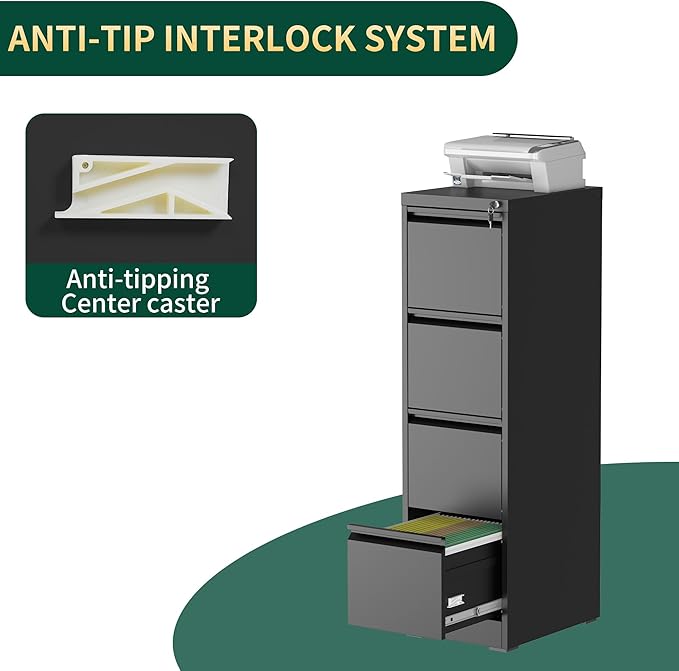 - 【Privacy Security and Anti-tilt Design】The interlock system secures the 4 drawers and comes with two keys to protect your files. The anti-tilt system ensures that only one drawer can be open at a time, preventing the metal file cabinet from tipping over. You can have peace of mind knowing that your important documents and items are safe and secure.