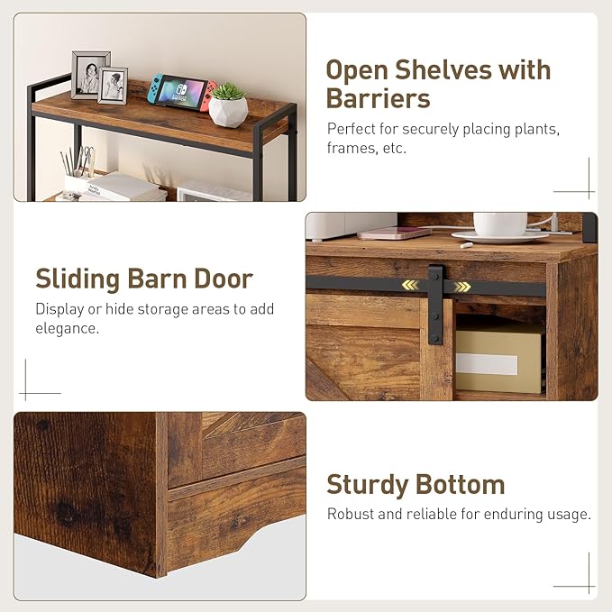 File Cabinet with Charging Station, Vertical Filing Cabinet with Shelves, File Cabinet for Home Office, Printer Stand with Storage Shelves & Barn Doors, Fits A4/Letter Files, Rustic