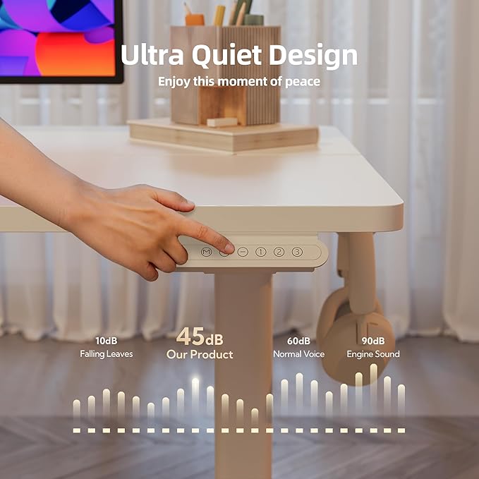 - 【Excellent Stability】The electric standing desk features a robust T-shaped steel frame and a durable wood desktop, holding up to 176 pounds. The wide desk foot design makes the adjustable table maintains good stability eliminating any distractions from wobbling even when at the full height. Certified for 50,000 durability cycles, this stand up desk maintains ≤45dB whisper-quiet operation.