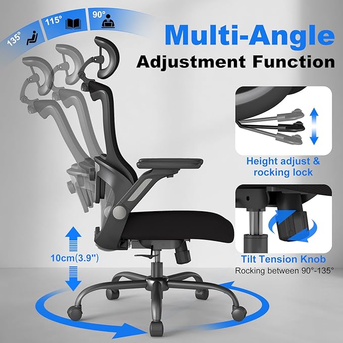 ZZH Ergonomic Office Chair, High Back Home Desk Chair with Adjustable Lumbar Support, Headrest, Flip-Up Arms, 90-135° Tilt Lock and Wide Cushion, Big and Tall Mesh Computer Seating with Wheels