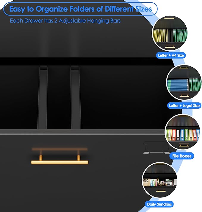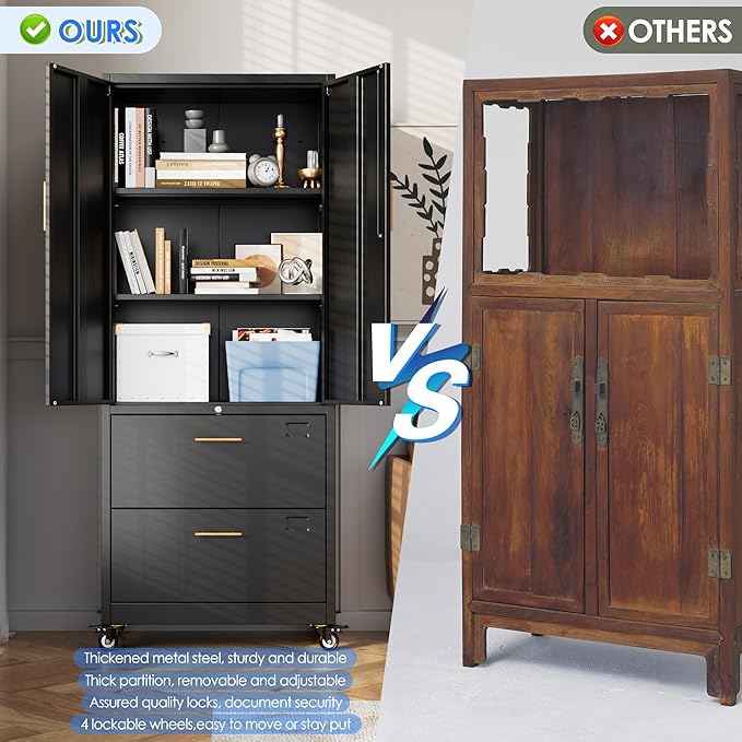 - [Large Storage]:METAN metal file cabinet with lockable doors and shelves,and 4 lockable casters has a adjustable shelves inside, which can be adjusted according to the height and size of the storage goods.The bottom 2 drawers is suitable for storing various documents,we have also set up hanging rod