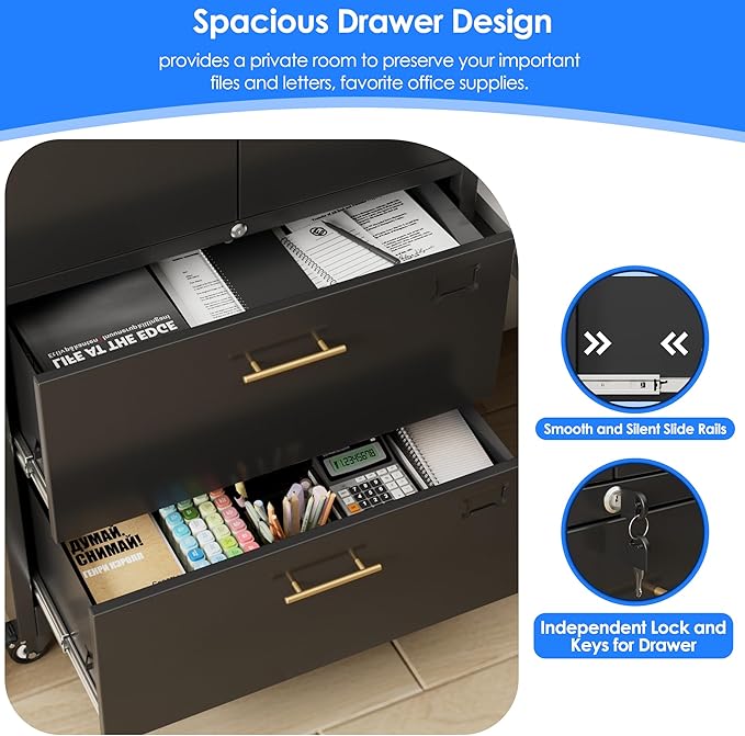 METAN Metal File Cabinet with 2 Drawers and 2 Shelves,Office Filing Cabinet on Wheels with Lock,Office Storage for Letter/Legal Size,Assembly Required,Black