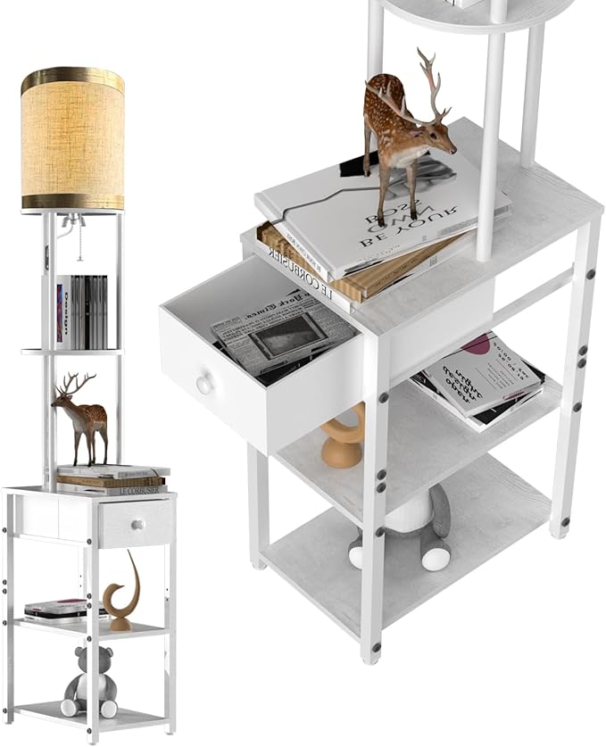 - ð¡ãLamp&Storage DesignãLightdot floor lamp with table and drawer features a 4-tier sturdy solid wood boards and a cylinder fabric lampshade, a circular storage table above can perfectly display decor like photo frame, and plants. The lower shelves with drawer is suitable for collecting books, and sundries such as charging cables. Combining storage and illumination into one space-saving solution, it provides ample lighting while freeing up valuable space in your living room or workspace.