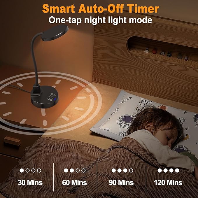 - Energy-Saving Timer & Night Light Mode – Set auto-off for 30/60/90/120 minutes plus one-tap night light mode for the lowest brightness. Perfect for bedtime reading, study sessions, or as a gentle nightstand lamp—saves energy and extends lamp life effortlessly.
