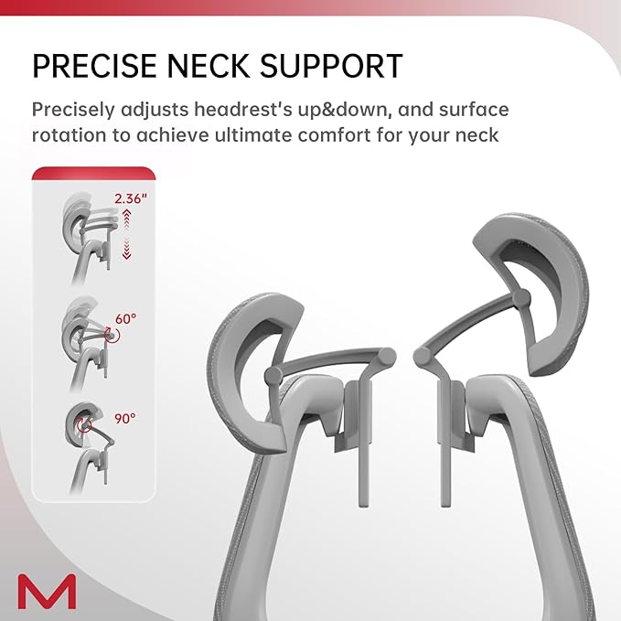 - 3D Adjustable Headrest - The width and height of the headrest are 13.8" and 6.3", much larger than other office chairs'. lt has an adjustable height range of 2.36". The 3D headrest has also design of flexible adjustment for optimal neck support, 90°fit rotation and 60°height rotation allowing for adjusting to your best position, promoting good posture for cervical spine health. The headrest is made of skin friendly flocked mesh fabric, soft to the touch and breathable, this headrest ensures a soothing and comfortable experience, keeping you cool and comfortable even during long hours of using.
