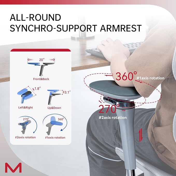 - All-rounded Synchro-Support Multi-Adjustable Armrest - The armrests of this ergonomic chair support 20” front & back adjustment, 1.8” left & right adjustment and 3.1” up & down adjustment to get the most comfortable sitting posture as you need. This armrest supports 360°1st axis rotation and 270°2nd axis rotation, which provides comprehensive arm supports in any gestures you want, even when reclining. The armrests are made with skin-friendly PU leather to provide you with more comfortable support. No matter what your need: eating, working, reading, resting or gaming, the multi-adjustable armrest could provide you the best comfy and relaxing experience.