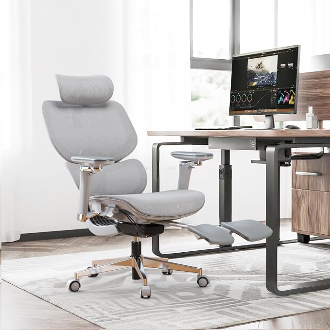 D2 PRO Ergonomic Home Office Chair with Self-Adaptive Lumbar Support,Desk Chair with Multi-Adjustable Armrest,Mesh Office Chair with 3D Headrest and Footrest (Grey)