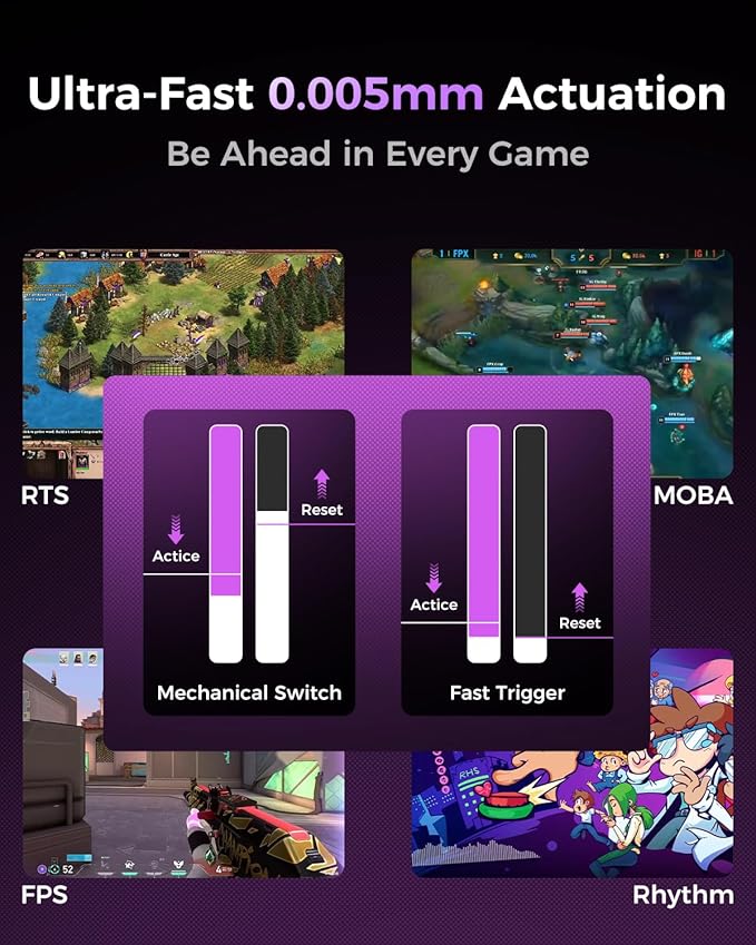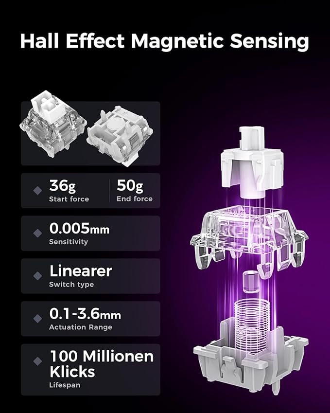 - Hall Effect Magnetic Switches for Precision Control -- Advanced Hall Effect technology provides lightning-fast 0.005mm sensitivity and adjustable actuation points (0.1–3.6mm), giving you full control over every keystroke.