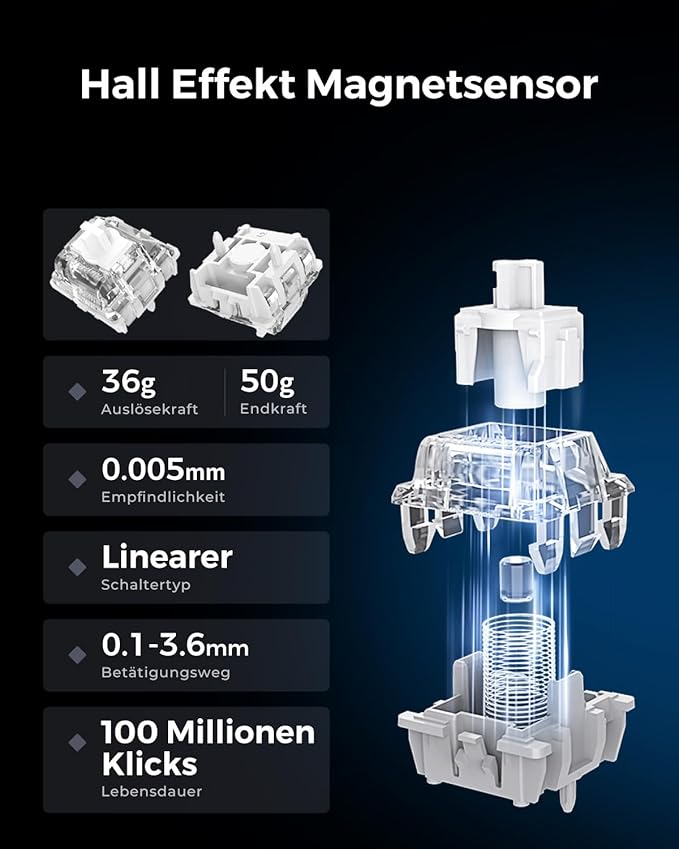 - Hall Effect Magnetic Switches for Precision Control -- Advanced Hall Effect technology provides lightning-fast 0.005mm sensitivity and adjustable actuation points (0.1–3.6mm), giving you full control over every keystroke.