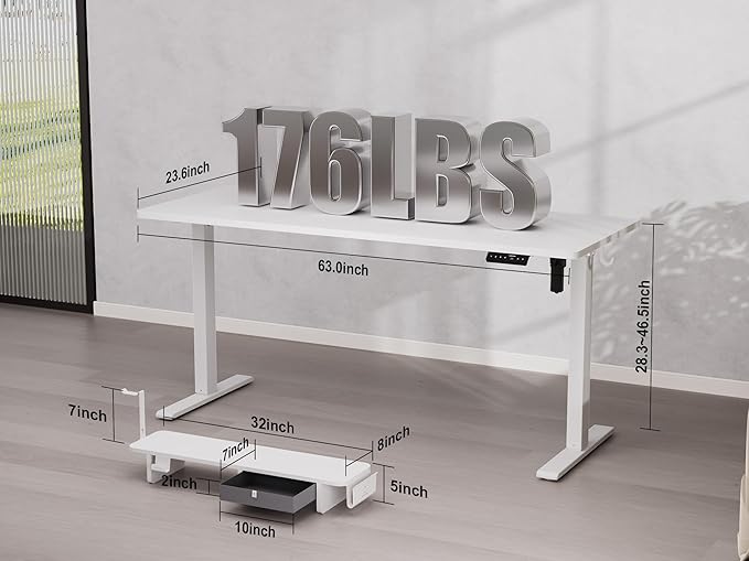 63x24 Inches Electric Standing Desk with Drawer and Monitor Stand, Height Adjustable Sit to Stand up Desk for Home Office, Ergonomic Computer Table with Phone Holder, 3 Hooks, White