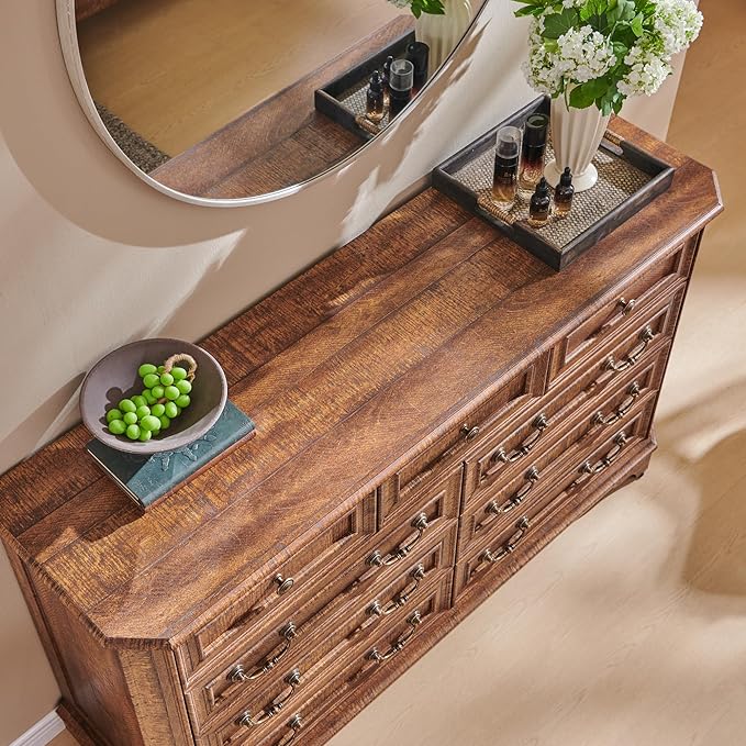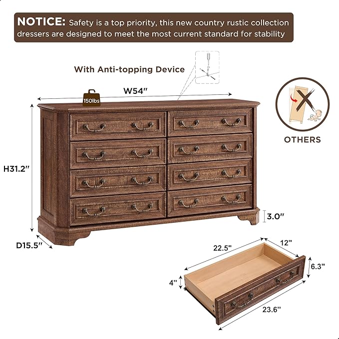 - FARMHOUSE 8-DRAWER DRESSERS: The rustic charm of this dresser adds warmth and coziness to any bedroom, creating a welcoming atmosphere. The natural texture of the wood brings a sense of authenticity and character to your living space, while the vintage design adds a touch of nostalgia and style. With its wide width of 54", this dresser is perfect for adding a touch of farmhouse charm to any bedroom decor.