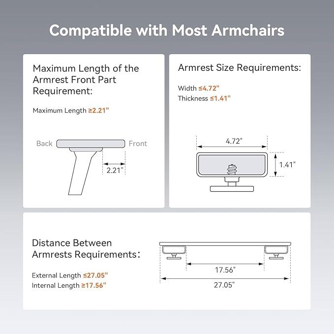 - Compatible with 90% Armchairs: The upgraded newtral laptop table fits more than 90% of armchairs. Armrest Size Requirements (Width ≤4.72"; Thickness ≤1.41"),Distance Between Armrests Requirements (External Length≤27.05"; Internal Length≥17.56"), Maximum Length of the Armrest Front Part Requirement (Maximum Length≥2.21"), reference our video and images to determine if the Newtral Tray is compatible with your chair