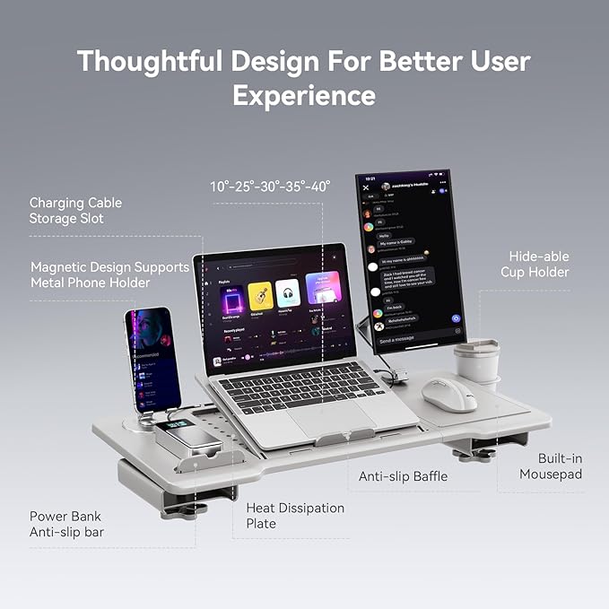 - Work from Home Essentials: Charging cable storage slot keeping all cords organized and anti-slip baffle keep your computer away from dropping off and magnetic design supports your phone firmly (need metal Phone holder). Hide-able cup holder allows you to swivel under the desktop when you don't need to use them to avoid bumping into them. What a thoughtful product!