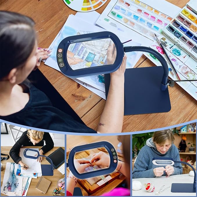 - Eye-Friendly & Adjustable Lighting: Protect your eyes while working on delicate projects with our lighted magnifying glass. The magnifier offers 5 color modes and a stepless dimmable. Whether you need bright daylight for precision work or a softer glow for relaxation, our magnifier with light covers it all and keeps your eyes comfortable all day long. More lighting versatility makes it perfect for needlework, puzzles, carving, embroidery, nail art, and more.