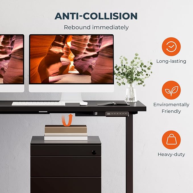 - Thoughtful L-Shaped Design: This L-shaped standing desk features a clever design that incorporates three spliced panels, effectively reducing the weight burden during installation. Additionally, this lift table has a collision avoidance feature to keep your workspace safe.