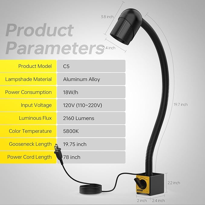 - Gooseneck Light :The gooseneck led machine light is made of high-quality aluminum alloy , which is sturdy and durable. 360° flexible silicone-coating gooseneck hose is rust-free, corrosion-resistant and heat-resistant.