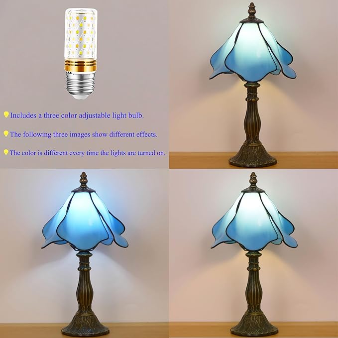 Small Tiffany Lamp Mini Stained Glass Table Lamp Bedside Accent Lamp Memory Sympathy 8X14.5 Inch (Blue)