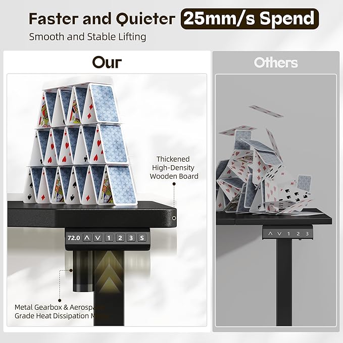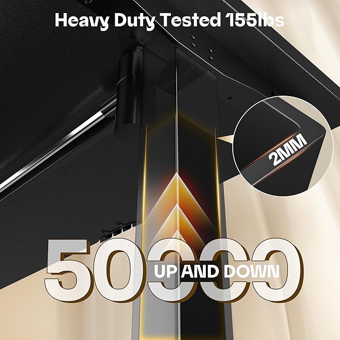 - Strong and Sturdy: This electric standing desk boasts an aerospace-grade lift system & industrial-strength desktop, supporting 155 lbs effortlessly. Reinforced dual crossbars minimize wobble, keeping monitors steady even after 50,000 test cycles. Type/write shake-free!