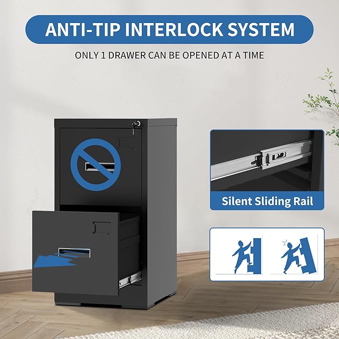 - 【Secure & Anti-tilt Design】Our office filing cabinets with 2 drawer feature a locking mechanism and anti-tip feature. When one drawer is opened, the interlocking drawer system prevents the other drawers from opening, preventing tip-overs and increasing safety.