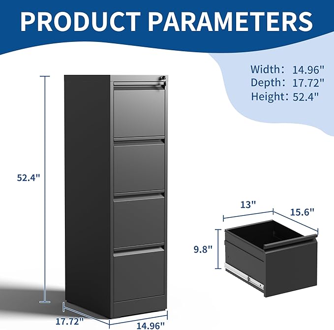 4-Drawer Locking Vertical File Cabinet, Metal Storage Cabinet for Office/Home – Secure Vertical Filing for Letter/Legal/A4/F4 Documents, Easy to Assemble Steel Cabinet (Black, 4 Drawer-52 H)