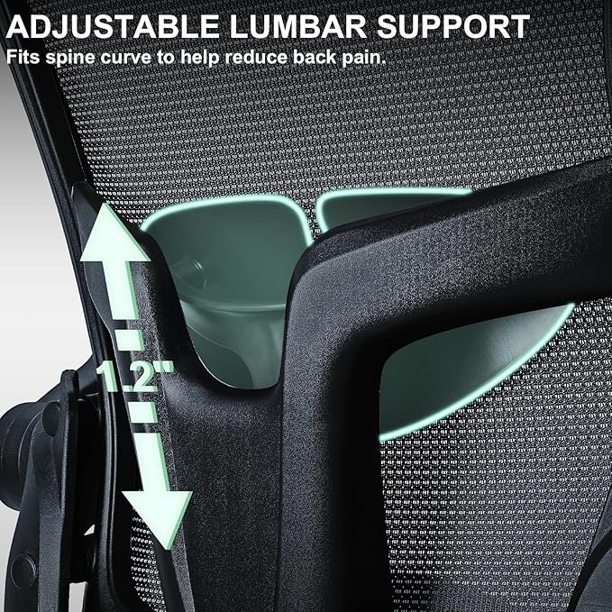 - 【Ergonomic Lumbar Support】This ergonomic office chair features an ergonomic S-shaped backrest that provides comprehensive support to accommodate the natural curvature of the spine. the lumbar support can be adjusted up and down 1.2 inches to accommodate people of different body types. Bringing ultimate comfort to your long hours of work.e Chair