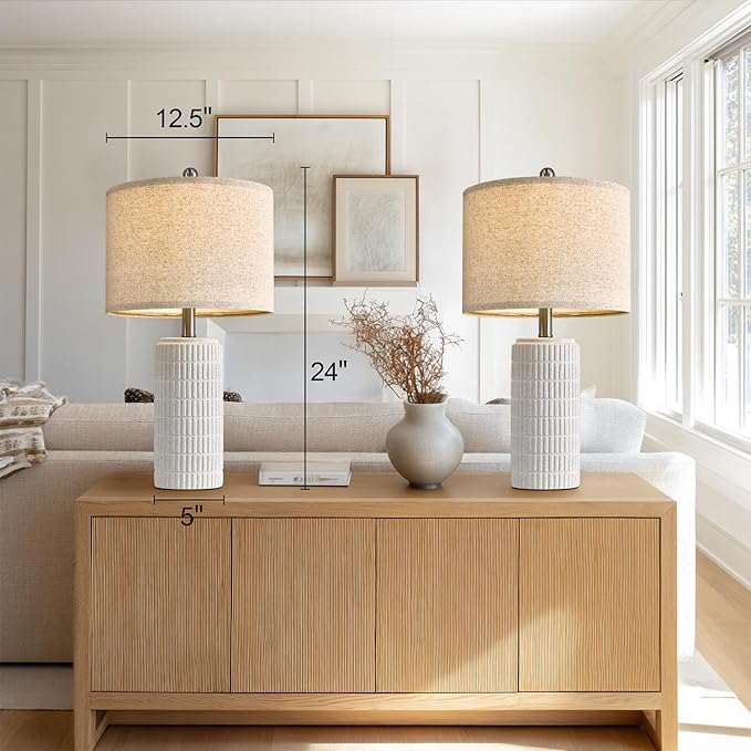 PoKat 24" Farmhouse Ceramic Table Lamps Set of 2 for Bedroom, White Stone-Like Bedside Lamps for Night Stands, Matte-Textured Decor Nightstand Table Lamps for Living Room End Table White