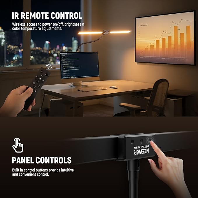 - 【32" Extended Dual Light Bars for Wide Coverage】 NEEWER N21 desk lamp for home office features 154 LEDs across two light bars, fully extending to 32"/81.2cm wide. It delivers up to 2200lux/0.5m, offering broad, even, and eye friendly overhead illumination that covers 2 computers simultaneously, with ample brightness to highlight every detail while reducing eye strain. The light bars tilts up & down for a broader or more focused light spread, ideal as key or fill lighting for designing/drafting