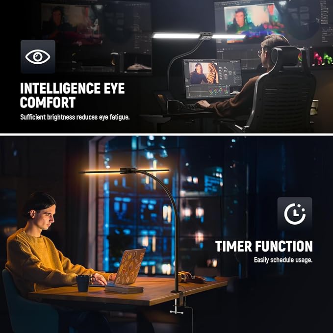 - 【Flexible, Adjustable & Remote Control】 The portable desk top lamp features a flexible neck that extends up to 47"/119cm and effortlessly bends for desired angle, desklamp equipped with a sturdy metal C clamp to securely clip on the desktop. Includes a remote for wireless access to power on/off, brightness & color temperature adjustments, providing multiple lighting presets: Dim, Afternoon Tea, Reading, Gaming, and Office for specific needs, as well as a timer function for scheduled use