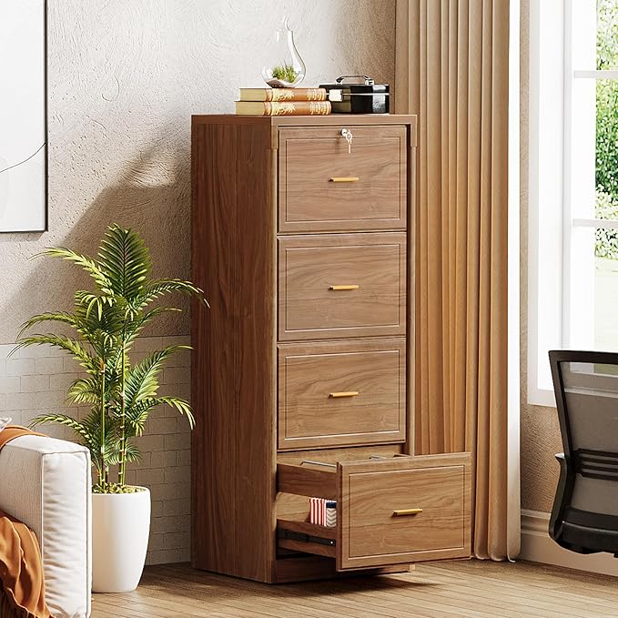 Tribesigns 4-Drawer File Cabinet with Lock, Locked File Cabinet with Key, Tall Wooden Filing Cabinets for Home Office, Vertical Office Storage for Legal Size/Letter/A4/Files, Brown